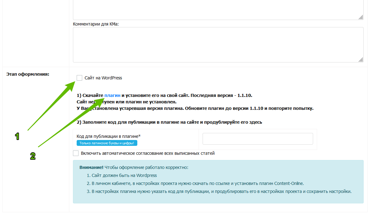 Чтобы статьи попадали к вам в публикации (черновики) необходимо (в настройках проекта) установить галочку Сайт на Wordpress и скачать наш плагин.