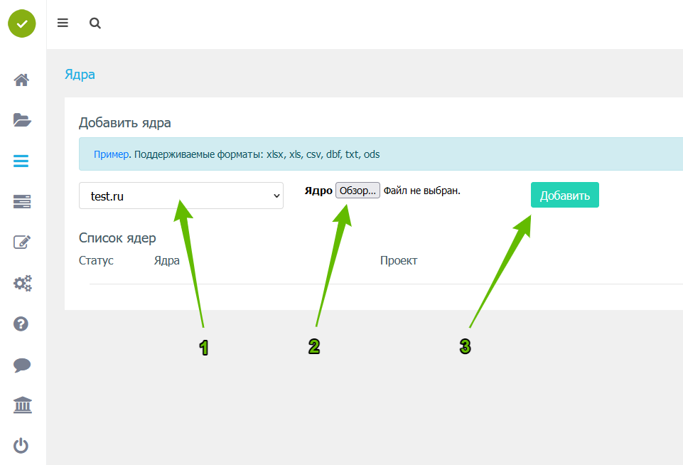 Прикрепите ядро в формате xlsx, xls, csv, dbf, txt, ods, выберите проект и нажмите добавить.